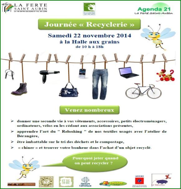 Chiner, Customiser, RECYCLER Publié le 5 Novembre 2014 par L'Atelier de Berangere Catégories : #Recyclage-Environnement Bonjour, Terminées les vacances! mais nos fourmis aux doigts de bronze sont encore en mode apprentissage aprés 5 semaines de réouverture de nos ateliers. De ce fait, je ne vous présenterai les réalisations des DEFIS sur ce théme que fin novembre, neanmoins, je reviens vers vous en compagnie de ce sujet car : L'Atelier participe le 22 Novembre dans le cadre de la semaine Européenne des Déchets au Salon du Recyclage des Déchets Textiles de la Ferté Saint Aubin sous la Halle. Je sais, je vous en "rabats" les oreilles comme on dit chez moi .....du recyclage..mais qui n'a pas chiné, transformé meubles, linge de maison, vêtements, cartons, aménager un jardin etc... Ce n'est pas être dans l'aire du temps c'est : SAUVER NOTRE PLANETE DE CE TROP PLEIN DE DECHETS dont 40% ne sont pas recyclables mais aussi CONSOMMER AUTREMENT. Me concernant, mes doigts vont se mettre en action la semaine prochaine, autant avec le tissu que le masking tape (ruban de masquage pour transformer vos meubles). Alors, qui à envie de venir en ma compagnie en cette journée? Nous aurons un espace atelier, vous allez customiser, transformer sur place. Une journée = un vêtements ou un accessoire ou un objet de déco...débutantes où pas, je vous attends et j'ai aussi besoin de vous pour faire un Atelier.... Que vous soyez adhérente ou NoN vous pouvez nous rejoindre et venir assister à cette journée avec votre matériel et vos vétements ou autres a transformer ainsi que vos fournitures. Je vous guide et invente ce que vous voulez sur place sous la Halle. Mesdemoiselles, Mesdames, Messieurs, inviter vos amies (is) à vous accompagner pour créer, puis découvrir les différents Artistes du Forum. Pour nous contacter: atelier.berangere@yahoo.fr où: 06.85.07.18.26 Ces Créations ne sont réalisées qu'à partir de vêtements recyclés, les objets en carton recyclé de zoé cartone,cravattes,robe de mariée, canevas, assiettes etc.... Voir les commentaires Partager cet article Repost0